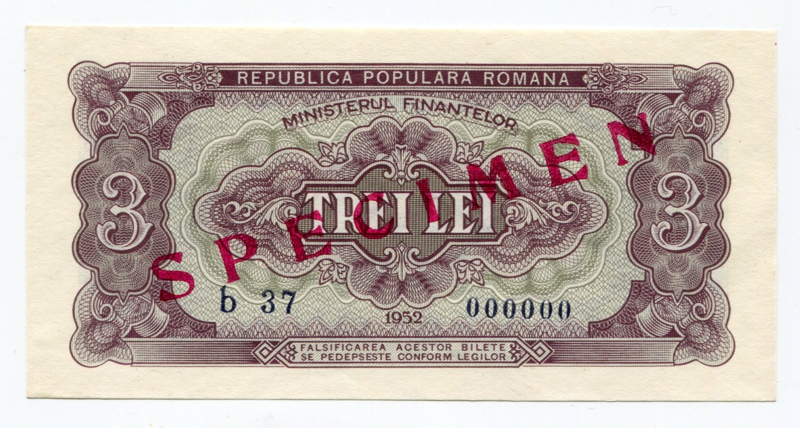 Romania 3 Lei 1952 Specimen - Інтернет-аукціон / Торги онлайн - Ціна - OneBid